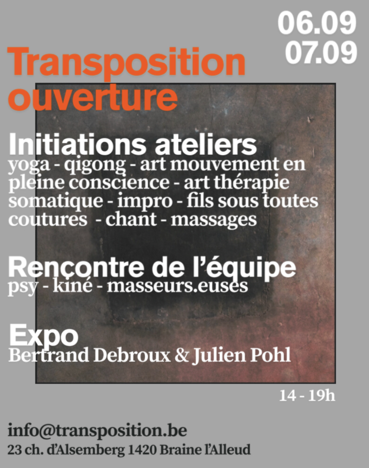 Transposition ouvre ses portes le samedi 6 et le dimanche 7 septembre de 14h à 19h lors de la braderie de Braine l’Alleud. L’occasion pour toutes et tous de découvrir le lieu, de rencontrer l’équipe, de s’initier aux différents ateliers proposés et d’assister à l’exposition de photographie Une transformation.